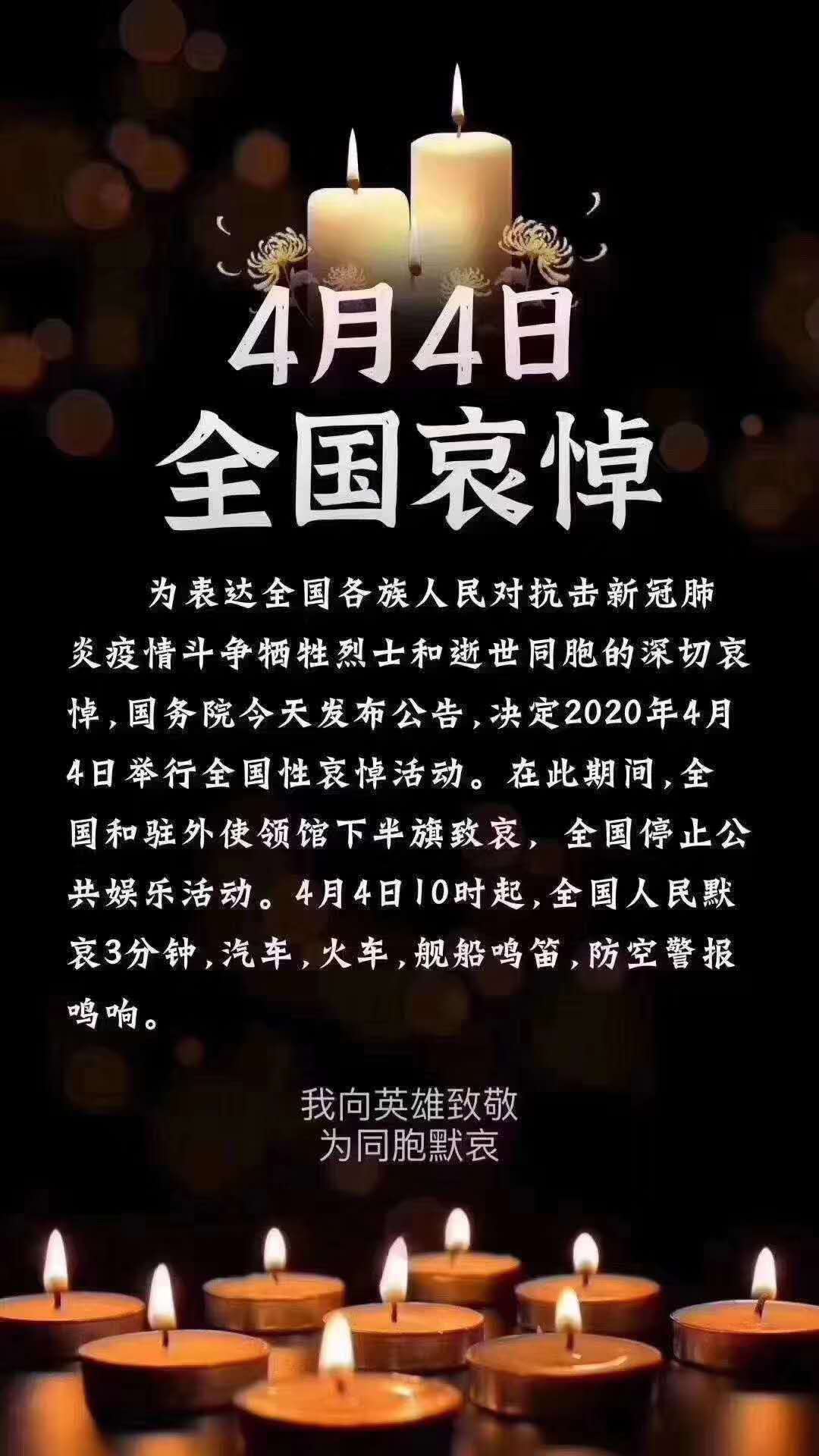 為表達(dá)全國各族人民對抗擊新冠肺炎疫情斗爭犧牲烈士和逝世同胞的深切哀悼,國務(wù)院發(fā)布公告,決定2020年4月4日舉行全國性哀悼活動。在此期間,全國和駐外使領(lǐng)館下半旗致哀,全國停止公共娛樂活動。4月4日10時起,全國人民默哀3分鐘,汽車、火車、艦船鳴笛,防空警報嗚響。